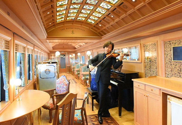 水戸岡鋭治氏が手掛けた気品ある空間で、ヴァイオリンとピアノの生演奏や、地域の食材を活かしたコース料理(洋食など)をお愉しみいただけます。