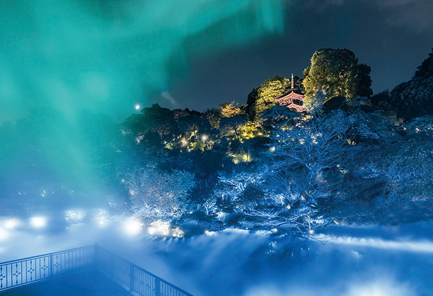 自慢の庭園では、朝昼晩と雲海が出現、まさに絶景をご覧いただけます。夜は「千の光のライトアップ」により幻想的な雰囲気に。本ツアー期間は、オーロラをイメージした光が広がる「森のオーロラ」と東京雲海が共演。霧の中に佇む三重塔が雲の上に浮かぶ「天空の三重塔(パゴダ)」など、一期一会の情景をご滞在中に何度でもお楽しみいただけます。