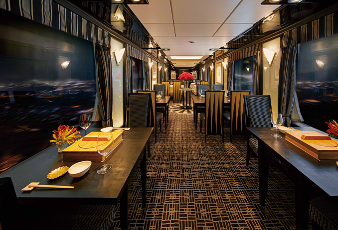 オープンキッチンから伝わる車内料理のライブ感を感じつつ、大きな窓を流れる美しい景色を眺めながら、食の匠による料理をお楽しみいただけます。