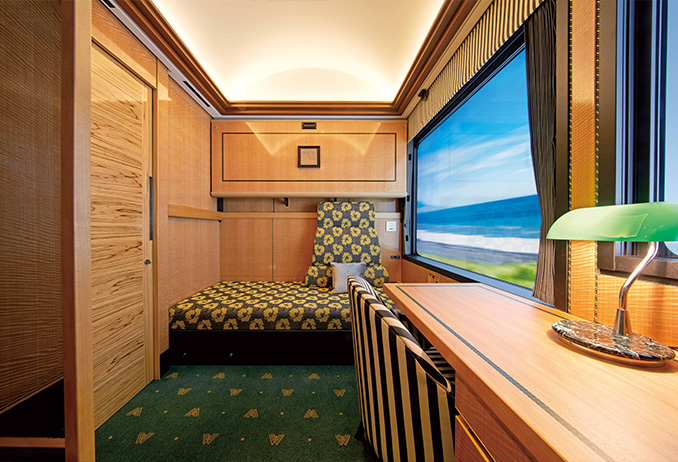 中国地方の5県の木材を用いたドアや沿線の伝統工芸品をあつらえました。また、収納式のベッドにより、昼間は広いリビングスペースでゆったりお過ごしいただけます。 客室にいながら列車の左右両側を眺望できるレイアウトと、大きな窓により車窓をお楽しみいただけます。さらに、開閉できる窓からは沿線の風を感じることができます。