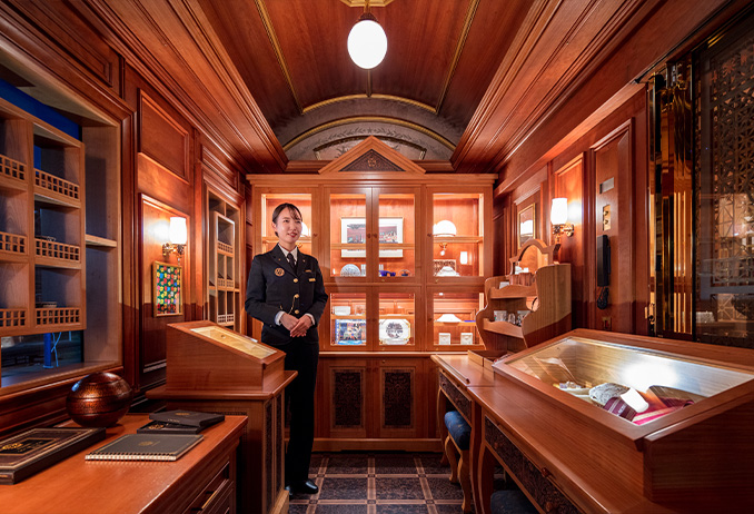 選びぬかれた九州ゆかりの優れた物品が並ぶ美術館のようなショップ。九州の伝統工芸品、現代の匠の作品、九州独自の食の名産品など、家に持ち帰って日常生活で楽しめ、人にも贈りたい、ななつ星ならではのセレクトによるアイテムが並びます。