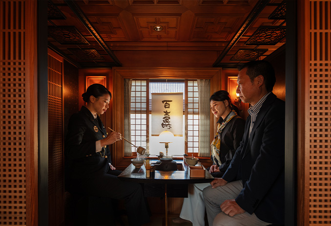 花月の歴史は1642年から始まります。鎖国の時代でもポルトガルをはじめオランダ、中国など世界と繋がっていた長崎ならではの和華蘭文化である長崎の伝統料理である卓袱料理。花月の伝統と「ななつ星」が融合したお食事をお楽しみいただけます。