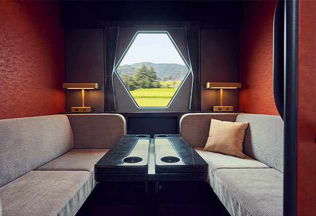 通常の座席に加え、個室、ソファ席やラウンジタイプのお席、など様々なタイプの座席をご用意。なかでも最上級の「コックピットスイート」はプライベートジェットをイメージして前方の窓から展望を広く見渡しながら「走るスイートルーム」としてゆとりある贅沢な空間をご提供します。