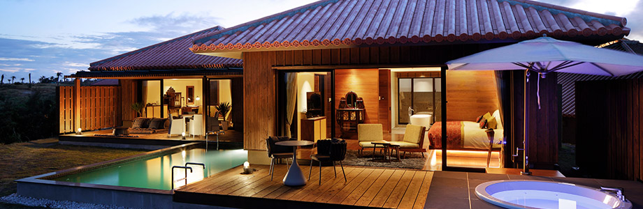 約7000坪の広大な敷地に19の客室が緩やかな斜面に沿って建てられ、客室はプール付きの戸建てヴィラをはじめ、スタンダードなツインやダブルなど全5種類。いずれの客室もオーシャンビュー、テラスにジャグジーを設え、コバルトブルーの海を望む、宜野座の豊かな自然を身近に感じる居心地のよい空間です。