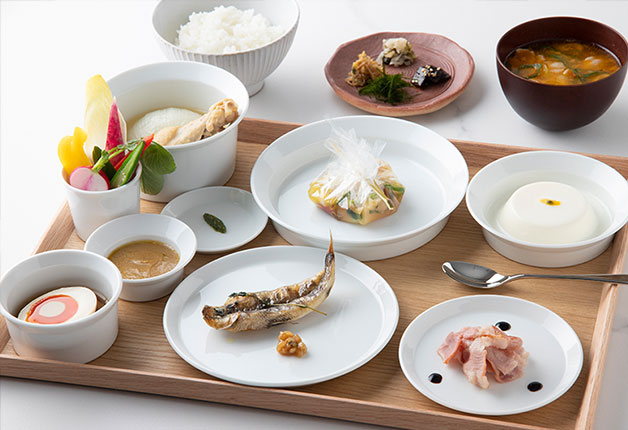 数種類のおばんざいや季節の魚料理をお愉しみいただける和朝食や、ジュース、自家製ヨーグルト、フルーツプレート、そして毎朝ホテルのベーカリーキッチンで焼きあげる自家製ベーカリーと、満足いただけるメニューを取り揃えているアメリカンブレックファストなど、お好みの朝食をお選びいただけます。
