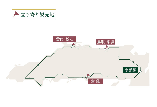 島根県松江市や雲南市では、その地に根付く歴史や文化に深く触れることができます。また広大な鳥取砂丘や風光明媚な東浜海岸では、雄大な自然をご堪能いただけます。特別な列車での移動に加え、各地での趣向を凝らした立ち寄り観光を通じて、記憶に残る旅をお届けいたします。