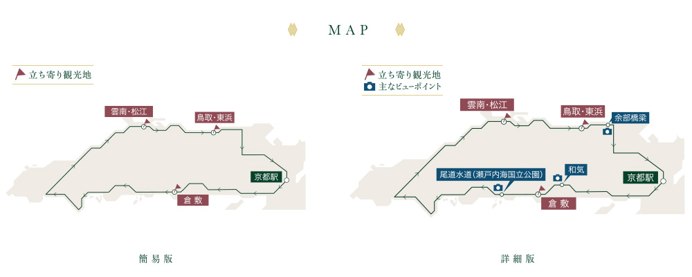 今回ご乗車いただく「せとうち・山陰コース(周遊)」は、車中2泊3日の旅程で、西日本の豊かな自然と文化、そして原風景を心ゆくまでご堪能いただける魅力的なルートとなっております。京都駅を発着点とし、山陽本線、山口線、山陰本線を巡ります。当コースの主な見どころは、美しい瀬戸内海の多島美を車窓からお楽しみいただけるほか、歴史ある倉敷美観地区の散策を通じて日本の伝統的な街並みを体験いただけます。