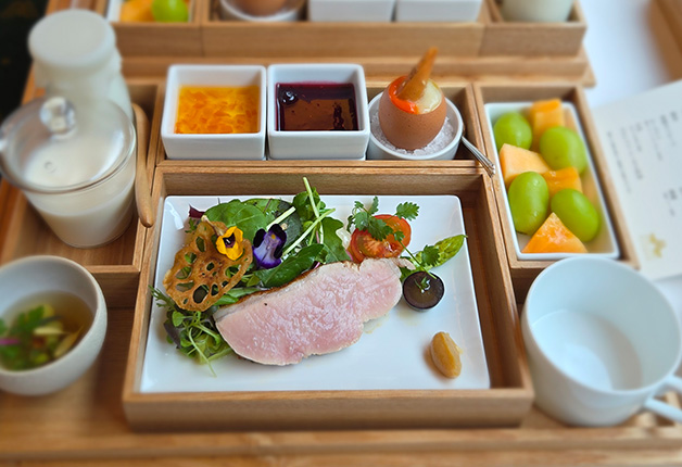 「HAJIME」オーナーシェフの米田肇氏が朝食を監修。沿線の多彩な食材を使った料理を車内の部屋にてご用意しました。