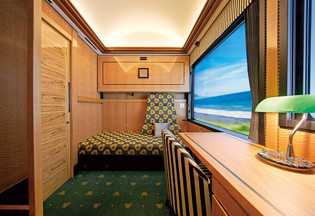 中国地方の5県の木材を用いたドアや沿線の伝統工芸品をあつらえました。また、収納式のベッドにより、昼間は広いリビングスペースでゆったりお過ごしいただけます。 客室にいながら列車の左右両側を眺望できるレイアウトと、大きな窓により車窓をお楽しみいただけます。さらに、開閉できる窓からは沿線の風を感じることができます。