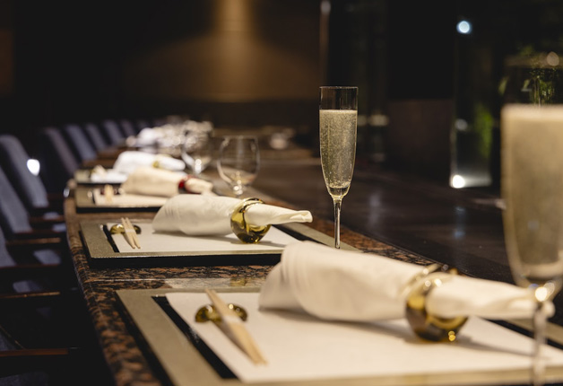 新宿ワシントンホテル ANNEX内にある「鉄板焼ふじた」は新宿の喧騒を感じさせない落ち着いた大人の雰囲気で、和牛や魚介の鉄板焼とソムリエが厳選したワインを堪能いただけます。今回はシェフが目の前で焼き上げるカウンター席にご案内。ライトアップされた中庭を背景に美食を味わいながらバレエの余韻をお楽しみください。