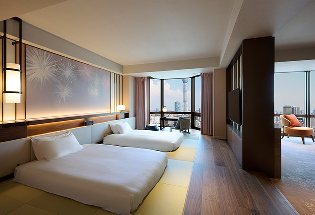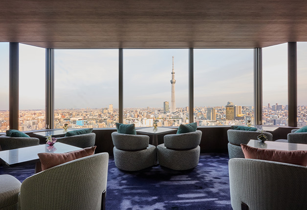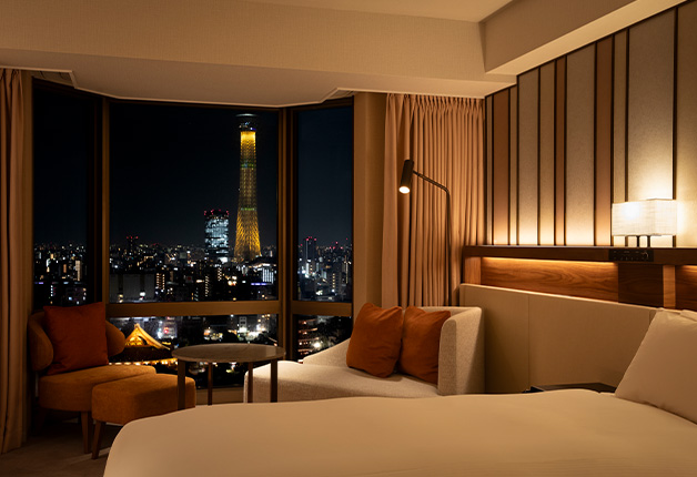 最上階から広がる唯一無二の眺望と、新しく生まれ変わったラウンジで上質なひとときをお楽しみください。 浅草を代表する風物を表現したエグゼクティブルームでは、 細部までこだわったインテリアと高層階から望む圧巻の眺望がお客様をお迎えいたします。