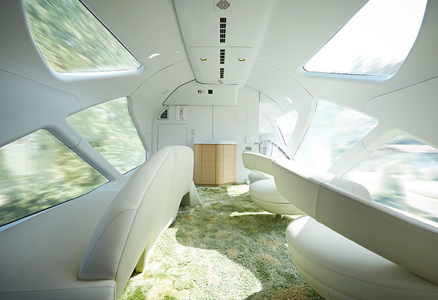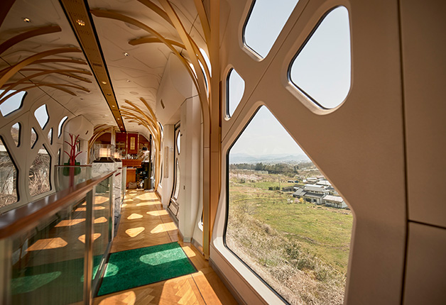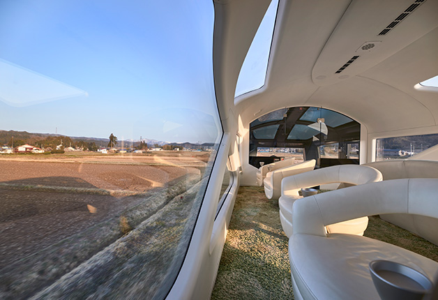 先頭車両と最後尾車両はいずれも展望車両。未来へ進む意志を、光のかけらのような窓で表現した開放的なデザインが目を引きます。ダイナミックに流れる車窓をお楽しみください。