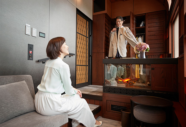 客室でくつろぐ開放感のある大きな窓で、客室での滞在も快適にお過ごしいただけます。壁には今や希少な和漆、岩手の浄法寺漆を使ったパネルや仙台箪笥をイメージした設えのクローゼット等、こだわりぬかれています。ミニバー、Bluetoothスピーカーが設置されており、好きな音楽を聴きながらプライベートな空間でおくつろぎいただけます。