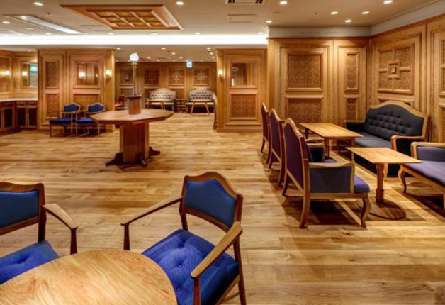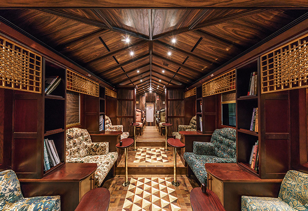 本棚のほかに書斎として利用できるデスクを配したライブラリーは、シックで落ち着いた車両。床には細かい寄木を施しています。一人だけの贅沢なひとときや、お客さま同士のふれあいのときなど、くつろぎの空間をご堪能いただけます。