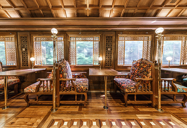 ウォールナットを使用したシックな空間で食事と音楽を堪能できるダイニングカー。電気鋳造技術を使った金色のパネルを壁に配したトイレや、カーテンで仕切れる化粧台も完備されております。