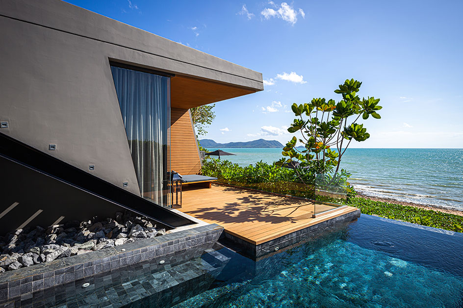 パタヤ湾を望むジョムティエンのビーチフロントに建つラグジュアリーリゾート。全ての客室にプールを有するヴィラで、打ち放しのコンクリートや天然石、木材を組み合わせたデザインもスタイリッシュです。
