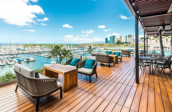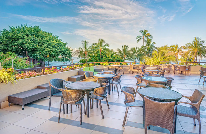 テラス席からの眺望、ハワイならではの開放感、時間帯によって楽しめるお食事やアルコールも充実しており、