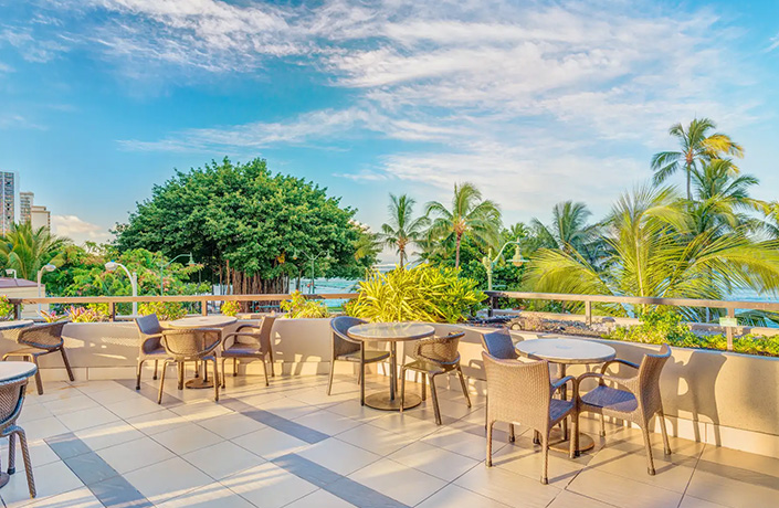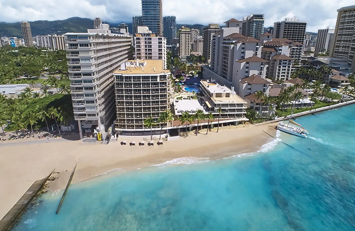 カラカウア通り沿いに佇み、ワイキキビーチが目の前に広がる洗練されたリゾートホテル
