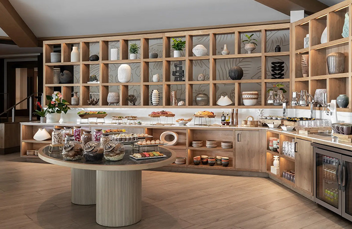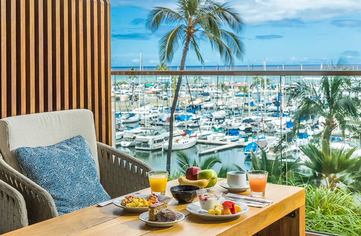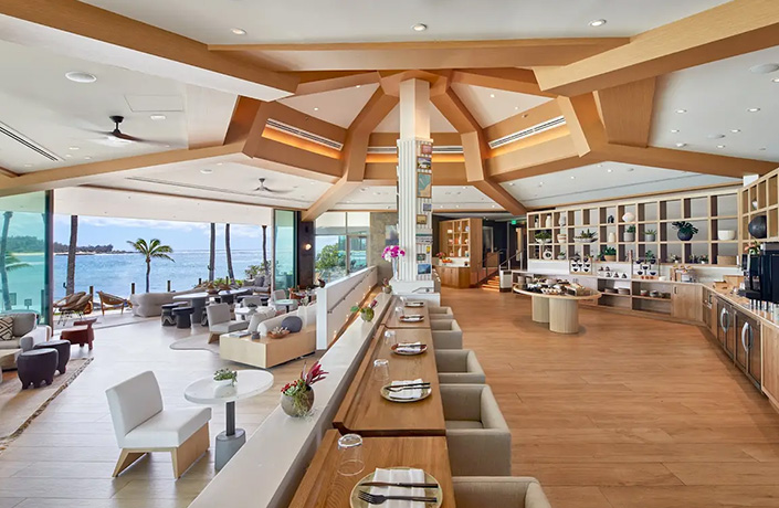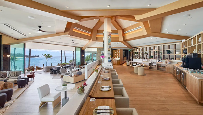 オーシャンフロントのラウンジで、ハワイ産食材を取り入れた温かな朝食を。卵料理やフルーツ、焼き立てペストリーも楽しめる、優雅な一日の始まり