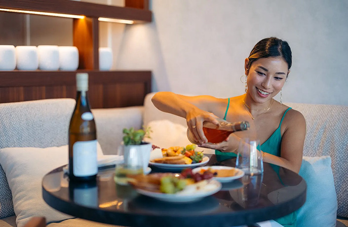 - フルーツやペストリーが豊富な充実の朝食。ご自身でオリジナルのアサイーボウルを作り、お召し上がりいただけます。混雑を避けて静かに過ごしていただけます。