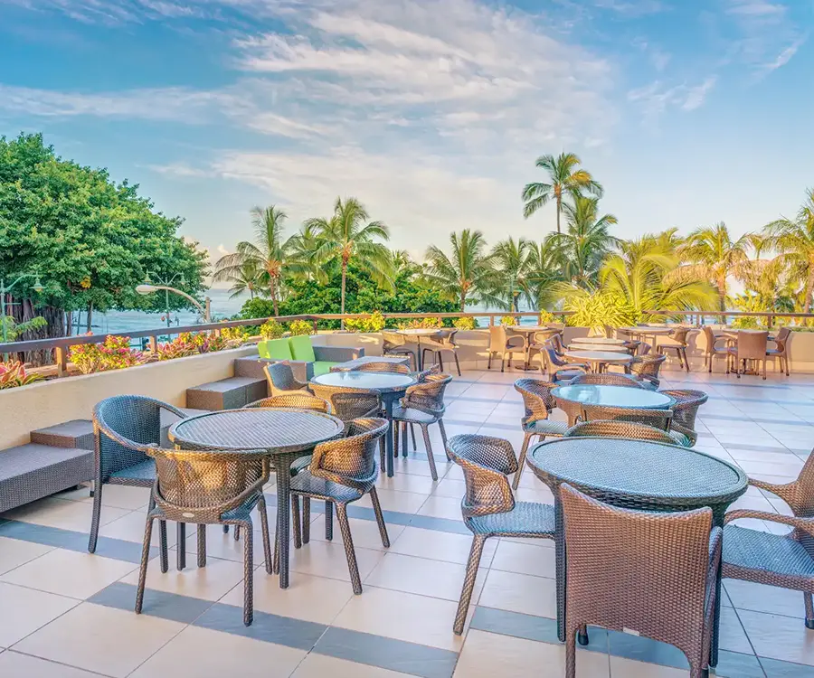 - 屋外テラス席もあり、ワイキキの空気を感じながらおくつろぎいただけます。カフェの代わりにもご利用いただける滞在拠点としての使い勝手も抜群です。