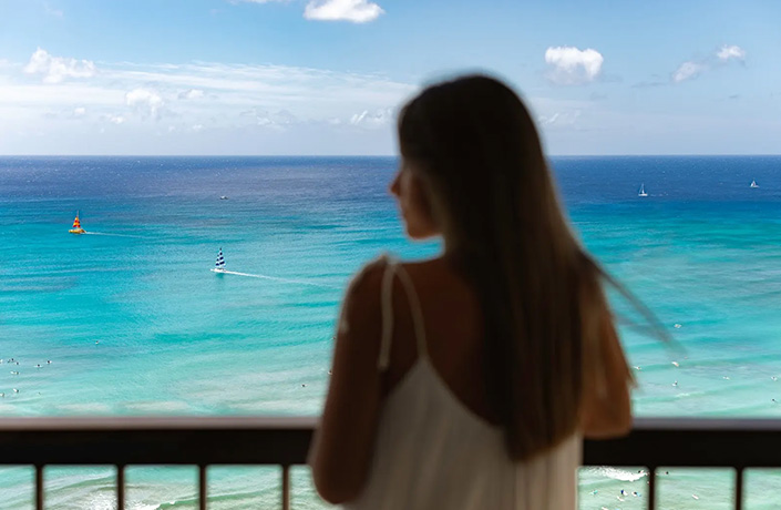 - プライベートラナイから海を真正面に望めるお部屋。高層階ならではの変わりゆくワイキキビーチの景色をお楽しみいただけます。