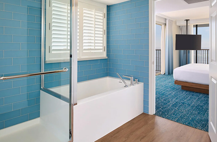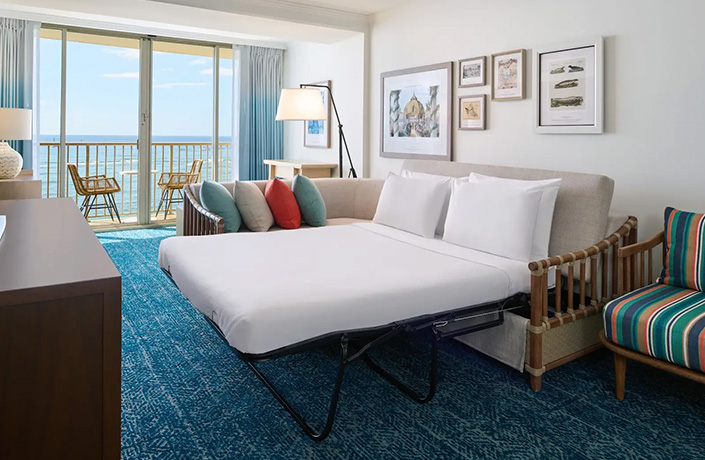 - オーシャンタワーまたはダイヤモンドヘッドタワーのコーナーに位置する開放的なスイート。リビングからもベッドルームからも美しい海岸線を眺めることができる贅沢な造りです。