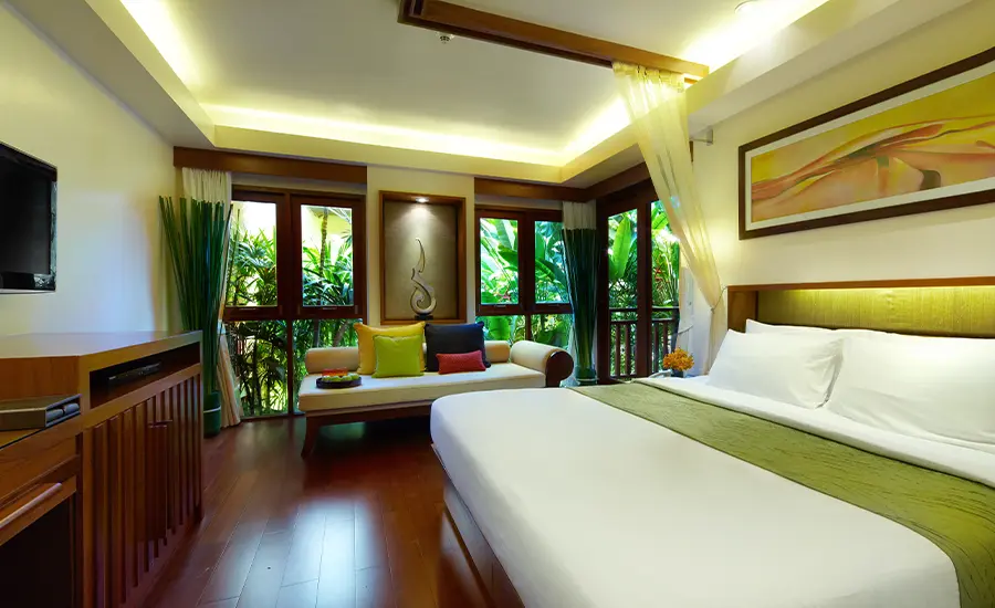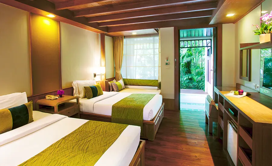約38~40㎡のお部屋。1階と2階に位置し、庭園の景色を望めます。デラックスリージェンシーは、カップルやお子様連れのご家族に最適です。エキストラベッドとしても利用可能なソファ、コネクティングルーム、バスタブとシャワー付きの広々としたバスルームをご用意しています。