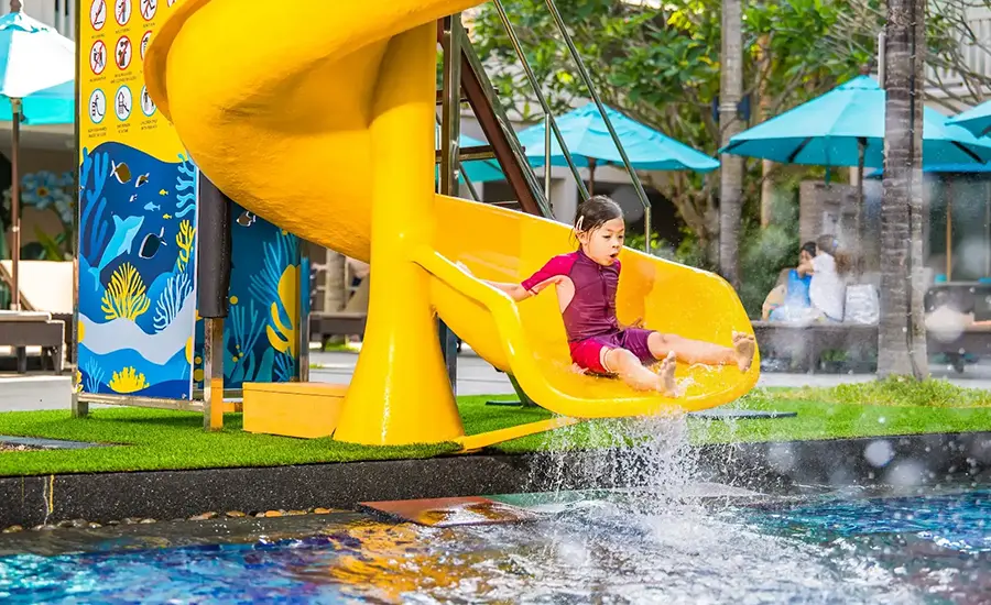 大人でもしっかり泳げる深さから、中間、そして浅い子供用まで3つのラグーンプールがつながるように配置されています。 キッズエリアには小さなウォータースライダーがあり、お子様連れでも安心して遊べます。 プールに浸かったままカクテルを楽しめるバーがあり、リゾート気分を満喫できます