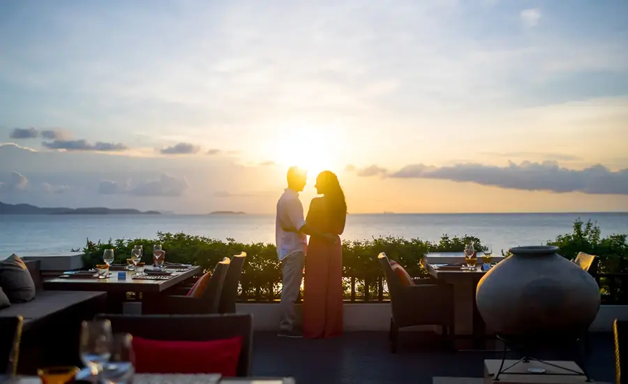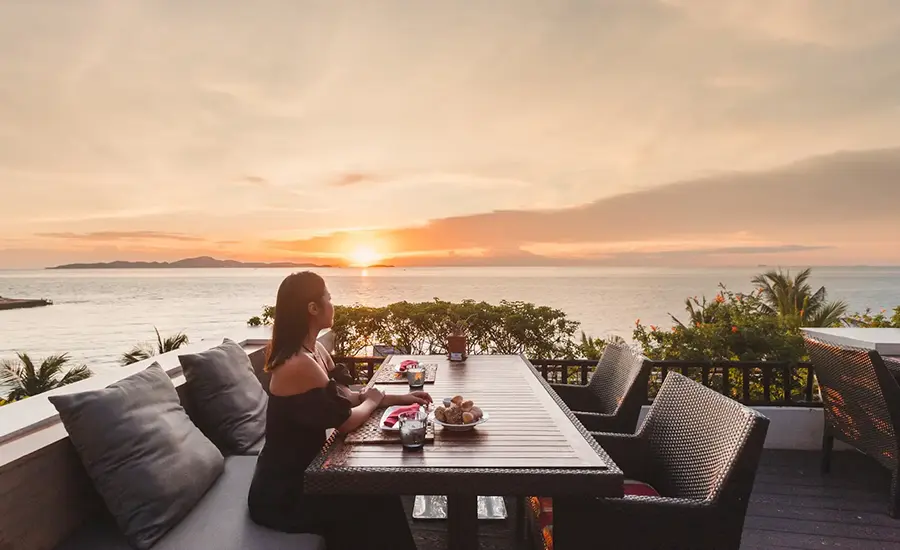 夕暮れ時は、イタリアンレストラン「Infiniti」のテラス席が特等席です。タイランド湾に沈む夕日を眺めながらの食事やドリンクをお楽しみください。