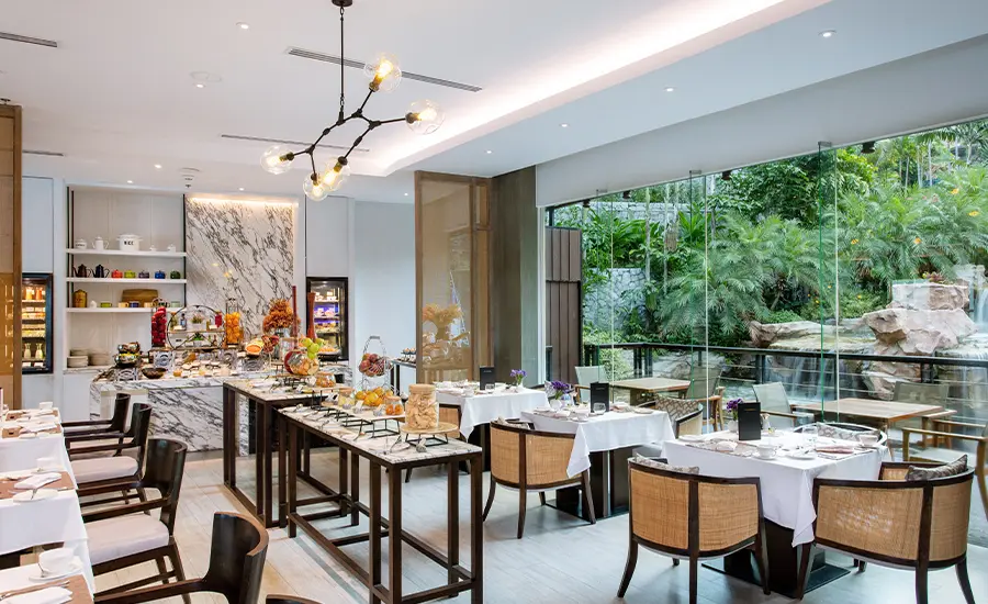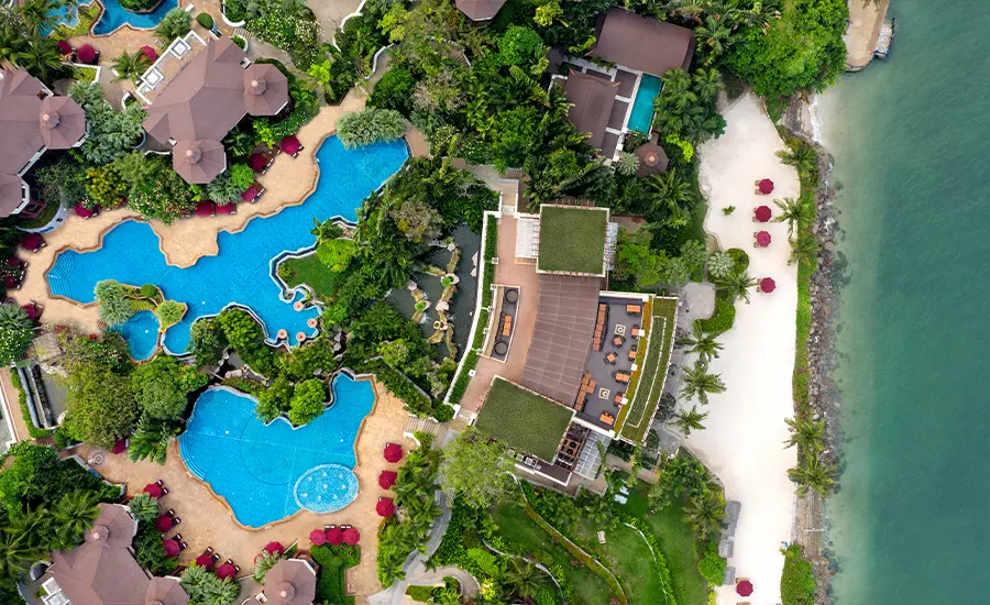 タイ湾を見下ろす緑豊かな岬に位置し、ビーチフロントのロケーション。快適で広々としたエレガントな内装の客室では、ゆったりとした贅沢なひとときをお過ごしいただけます。アジア風のコンテンポラリーなデザインと広々としたバルコニーがセンスの良い空間を演出しています。 館内の3つのレストランも充実。