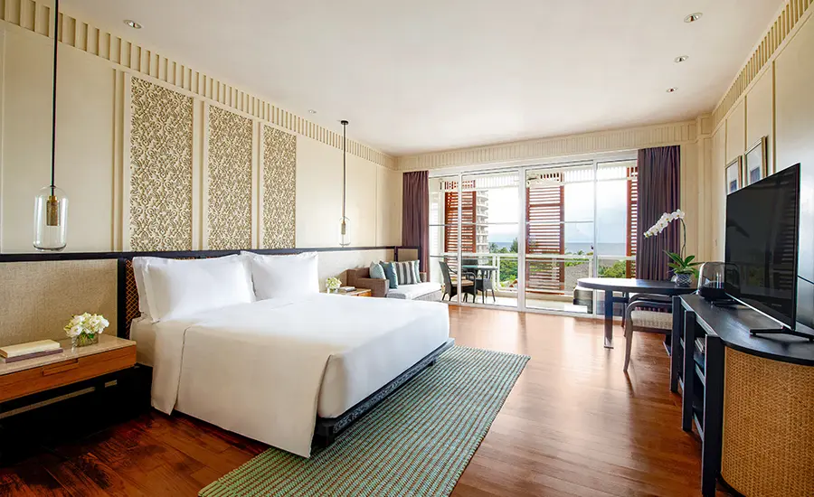 約45㎡のお部屋。伝統的なホアヒンと現代的なタイの豪華さを融合したエレガントなデザイン。 全室にバルコニーまたはテラス、独立したシャワーとバスタブが備えられています。