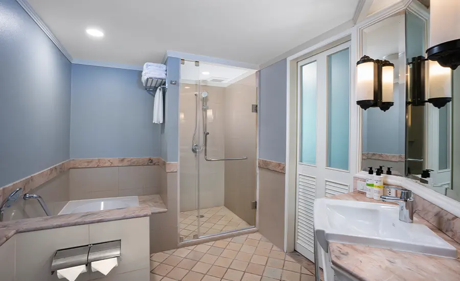 約44㎡の客室。バルコニーからは、ガーデンビューをお楽しみいただけます。設備の整ったツインベッドルーム、ソファ、リラックスできるベランダチェアを完備しています。デスクを備え、Wi-Fiアクセスと42インチのHDTVをご用意しています。バスルームには、独立したバスとシャワーを完備しています。