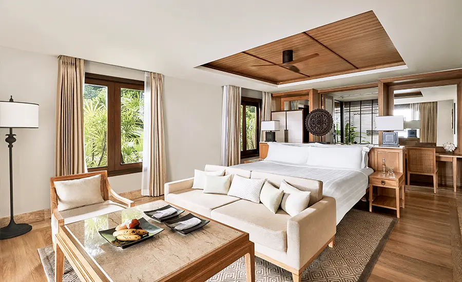 鳥の巣のようなシダとヤシの木に包まれたプライベートスイート。緑の木々に囲まれたリフレクションプールからは、最高のパノラマオーシャンビューをお楽しみいただけます。広さ約135㎡、キングベッド1台のお部屋になります。