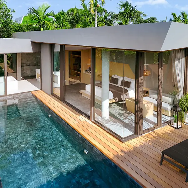 パタヤ・ベイを望むジョムティエンのビーチフロントに建つ、ウルトラモダン・ラグジュアリープールヴィラ。全室キングサイズベッド。デザインは著名な建築家によるもので、全室に7~10メートルの幅のプールがあるなど、ハネムーンやカップルに理想的。また客室内のミニバーは滞在中毎日補充があり無料でお楽しみいただけます。